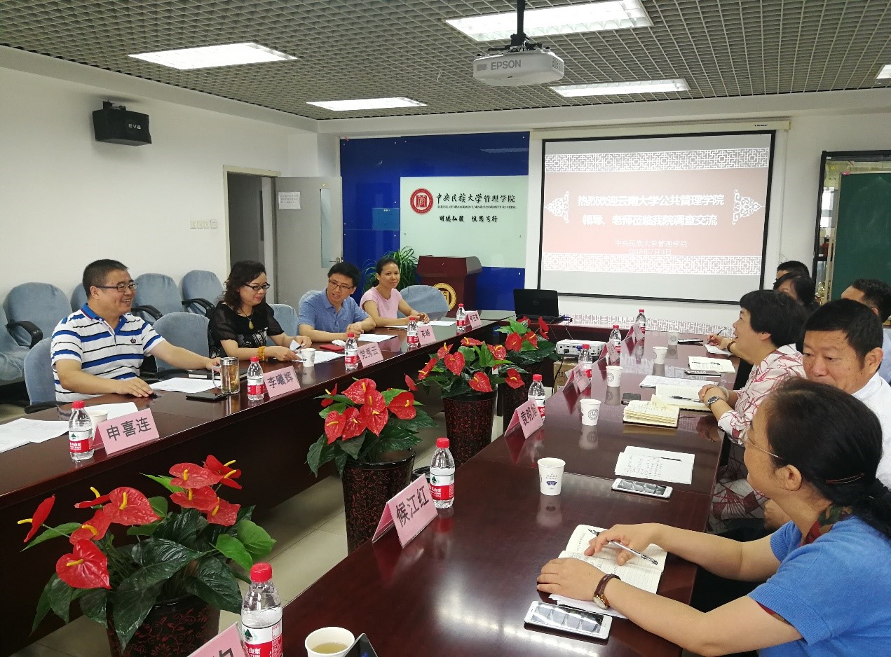 7月3日上午9:30-12:00,王燕飞副经理一行来到中央民族大学管理学院,与中央民族大学管理学院经理李曦辉教授、公共管理系党秀云教授、申喜连教授、车峰教授、韦玉寒老师、浦晶老师等进行了座谈。围绕专业建设和学科培养的特色问题,双方进行了友好的交流。
